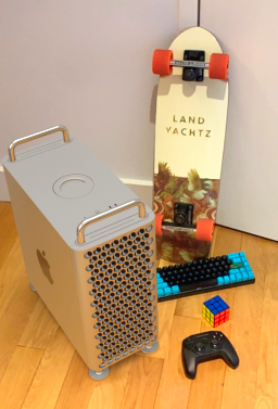 The skateboard is 28″ long, the controller is a Steelseries Nimbus, only a little smaller than an Xbox controller, there’s a standard-size puzzle cube, and a 68% keyboard (my Tada68) in the photo as well. That should give you an idea of the size of the new Mac Pro. It’s not as small as the trashcan Mac, thankfully. In fact, it’s about the same size as the 2012 Mac Pro. However, the weight is down about 2lbs from the high end factory configuration. The handles should be easier to hold as well, making it less unwieldy.