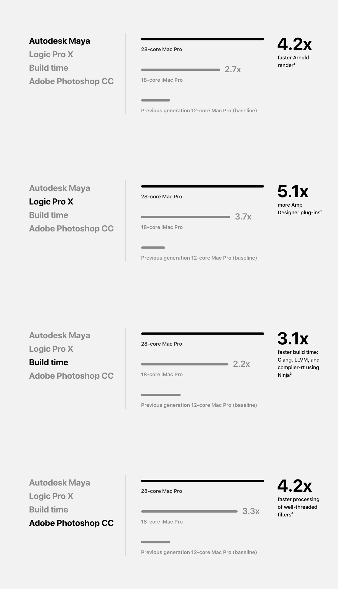 Okay, car comparisons aren’t the best way to put this into perspective. Let’s instead look at Apple’s comparisons to previous Apple hardware. Using a few professional applications, Apple measured the improvement of performance between the old Mac Pro, the new iMac Pro, and the new Mac Pro. To clarify this, remember that the iMac Pro is an extremely powerful machine, as was the 12 core Mac Pro, in its prime.