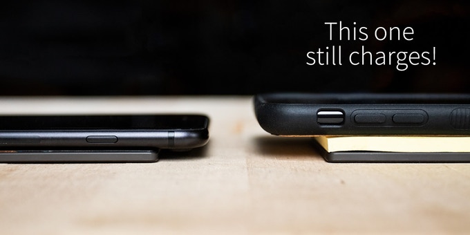 So you might be wondering why you’d want a super thin charging pad. Does it matter? It’s not like you’re holding this in your hand, right? A thin charger is certainly more portable, so you can bring it on trips. But the real benefits of that thin pad is its ability to charge through a large area. Because the top is thin and the coil is the lone electronic part in the charger, there’s no large air gap between the coil and the top of the charging pad. This means you can still charge with a thick case. Even if you have the thickest Otterbox case, you’ll still be able to charge. In fact, Carved tested it with a notepad and a thick case.