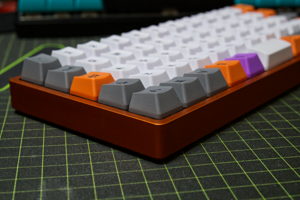 I would love to use this with some DSA or SA keycaps. Something with a spherical keycap design. However, as I’ll point out below, this actually came with some amazing keycaps. They look great and you can color match them to the aluminum, as I did, for a very cool look. The appearance of the anodized aluminum and those rows of keycaps? Awesome. Plus the case, while still being quite slim, comes up over the switches. This is a perfect look for a keyboard like this, giving it a sort of sunken-in, compact appearance. It’s such well balanced design, you’d think Apple made it, if Apple actually made any good keyboards.