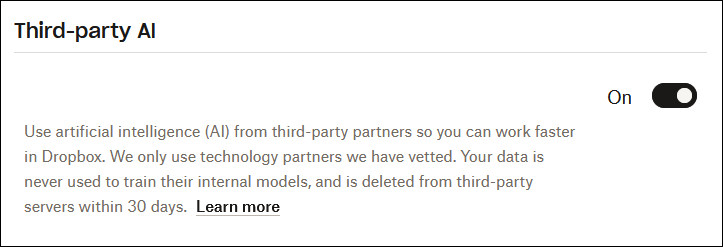 “Your files within Dropbox are sent to a third-party AI only when you chose to interact with AI powered features. For example, when you ask a question about a file.”